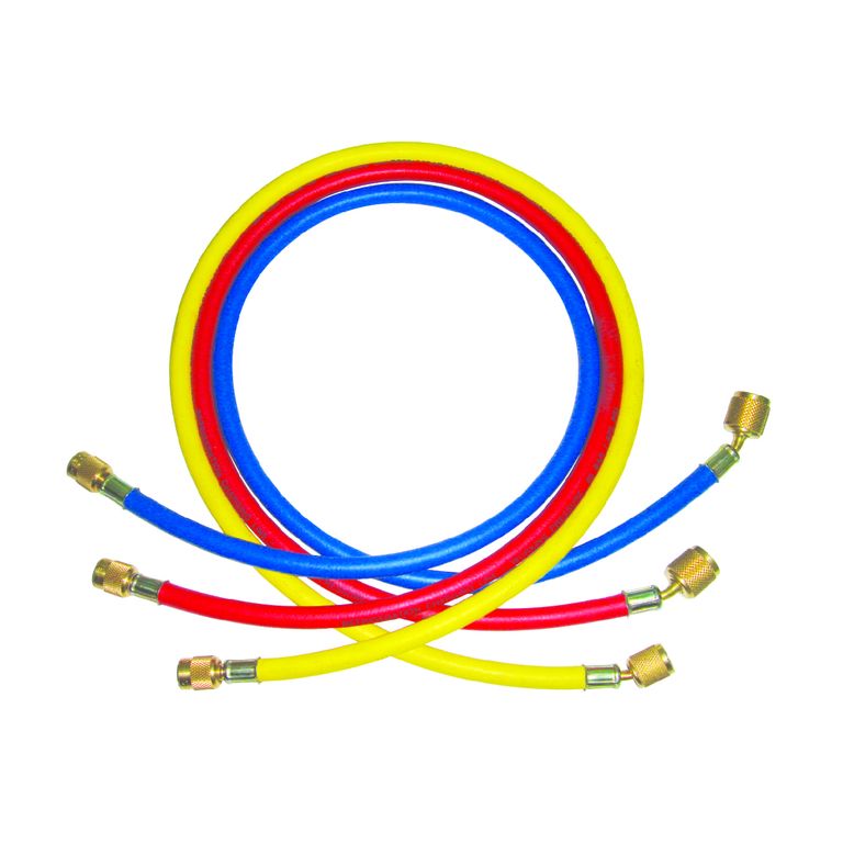 Комплект заправочных шлангов (красный,желтый, синий) длина 1,5 м, с рабочим давлением 600 psi. Для фреонов R134,R404,R22,R410.