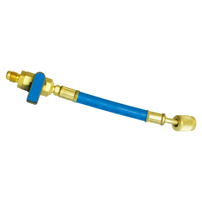 Заправочный шланг высокого давления с шаровым краном (синий). Рабочее давление 800 PSI. Шланг с переходами 1/4 SAE 5/16. Их используют для подсоединения к весам с клапаном, вакуумным насосам, станциям рекуперации, баллонам с фреонами, азотом и к другому оборудованию для кондиционеров, холодильников.