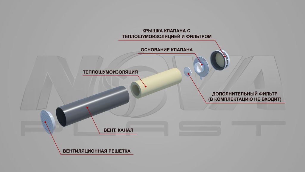 Стеновой шумозащитный клапан NovaPROF, комплектуется фильтром класса G-3, теплозвукоизолирующим стеновым каналом и внутренним корпусом, предназначен для осуществления нормативного воздухообмена в помещении, с контролем потока воздуха, в соответствии с СП 60.13330.2020 «Отопление, вентиляция и кондиционирование воздуха».
